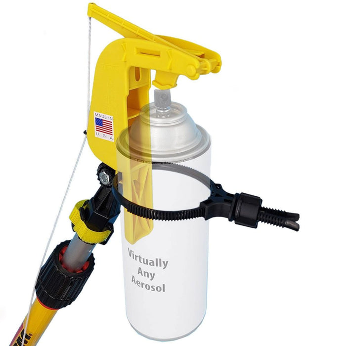 Este sistema innovador permite accionar a distancia cualquier aerosol estándar simplemente enroscándolo al aplicador y montándolo sobre una pértiga extensible con rosca.